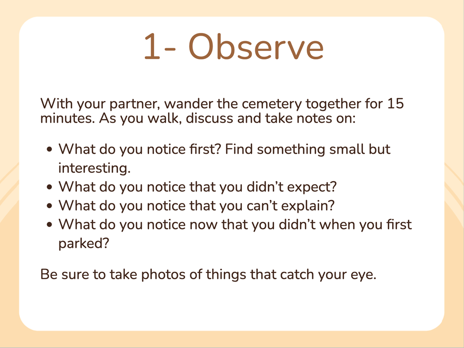 To rework the familiar LOC framework into a cemetery-specific version, I adapted the questions from the LOC’s generic Primary Source Analysis Tool to guide the students’ work for the day. I created a slide deck using Nearpod, so they could easily access the protocol on their cell phones. For the Observe phase of the analysis (Figure 1), the questions that guided students’ exploration were: What do you notice first? Find something small but interesting. What do you notice that you didn’t expect? What do you notice that you can’t explain? What do you notice now that you didn’t when you first parked? I also asked them to be sure to take photos of things that caught their eyes which they could upload to the Nearpod’s collaboration activity slide. This phase, they did with a partner.